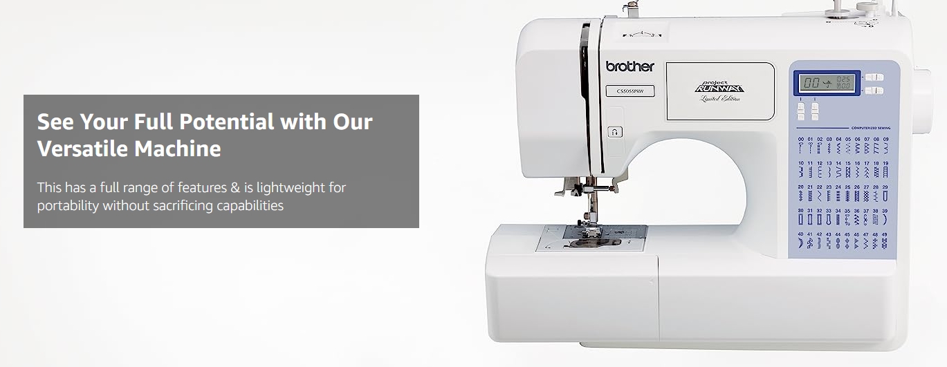 Create high-end fashions at an affordable price, with this incredibly easy to learn and use, exclusive Brother Project Runway computerized sewing machine. The CS5055PRW offers complete couture-level solutions to help you leverage your sense of style into one-of-a-kind, runway-ready fashions. Experience easy, reliable threading of both top and bottom threads; virtually effortless sewing on a wide range of fabrics, and the ability to add professional quality buttonholes, zippers, decorative top stitching and neat, overcasting edges to your favorite creations. The CS5055PRW includes 50 built-in stitches that cover a wide range of utility, decorative, heirloom and quilting stitch functions, and your entire selection of built-in stitches is printed on the front your machine, for easy reference. Simply select your desired stitch on the informative LCD display screen and adjust the stitch to your specific needs. And for truly custom results, choose from the 5 one step buttonhole styles that are actually custom-sized to fit your specific buttons. Includes 6 specialty sewing feet, complete bilingual English and Spanish instruction manual, and a 25-year limited warranty. ;.